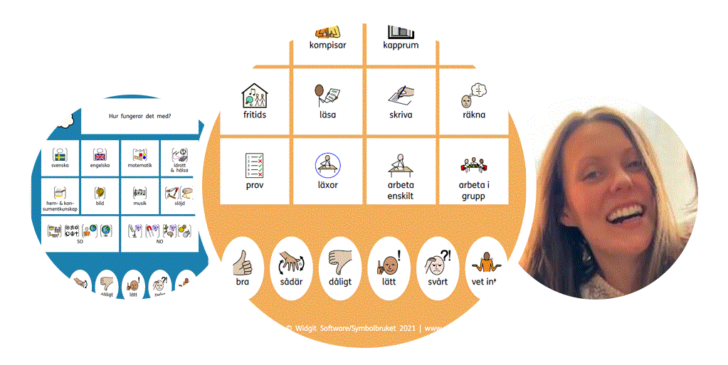 Med bildstödskartan kan du visa hur du tycker att det fungerar med olika saker i (skol)vardagen. Du kan peka på bilderna när du ställer en fråga eller berätta ditt svar genom att peka på bilderna.